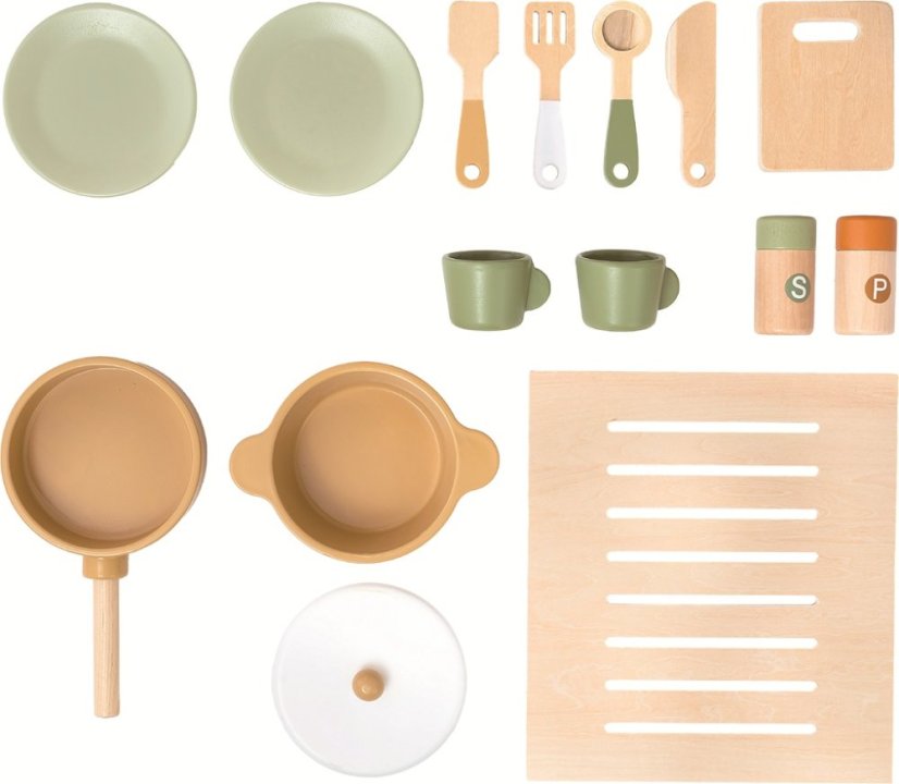 Chcete teplý domáci koláčik? Alebo snáď máte chuť na niečo vyprážané? S touto kuchynkou môžete mať menu podľa Vášho priania. Je totiž plne vybavená! Nájdete tu všetko, čo v modernej kuchyni nesmie chýbať - sporák s rúrou, výrobník ľadu, mikrovlnku, drez, kávovar a samozrejme riad s náradím, ako sú taniere, hrniec, panvica, hrnčeky, nôž, naberačka a ďalšie. Vďaka otváracím dvierkam a otočným gombíkom je pôžitok z hry ešte realistickejší. Všetko je vyrobené z kvalitného pevného dreva a ošetrené netoxickými farbami. Tak si nasaďte kuchársku čiapku, oblečte zásteru a dajte sa do varenia! Obsah balenia: 2x tanier, 2x hrnček, 1x panvica, 1x hrniec, 1x pokrievka, 1x korenička, 1x soľnička, 1x doska, 4 ks náčinia, rošt do rúry. Hlavné vlastnosti: súčasťou je bohaté príslušenstvomultifunkčné, rozmanité využitierozvíja komunikačné a sociálne zručnostimotivuje k predstavivej hrevhodné pre deti do 3 rokov