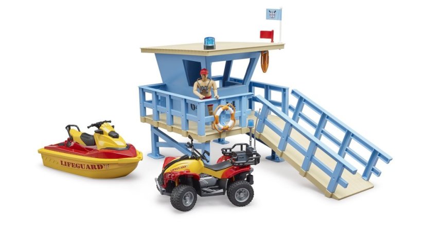 Z hliadkovacej veže má plavčík dokonalý prehľad o dianí a je pripravený ihneď vyraziť. K dispozícii je mu široké príslušenstvo, kruh, plavák, ďalekohľad a trojica signálnych vlajok. Ponúka sa mu však hlavne rýchla štvorkolka a vodné skúter, záchrana topiacich a udržiavanie poriadku tak nie je žiadny problém. Strecha veže je odnímateľná a s figúrkou si možno bez prekážok hrať v jej kancelárii. Nemusíte sa báť skúter spustiť na vodu, skutočne pláva! Veža a všetko príslušenstvo ponúka realistické spracovanie kompatibilné s figúrkami BRUDER BWORLD. Vyrobené v Nemecku, z kvalitných materiálov. Hlavné vlastnosti:veža, figúrka s príslušenstvom, vodný skúter, štvorkolka a rotačný majákodnímateľná strechakompatibilita s BWORLD figúrkamivyrobené v Nemecku