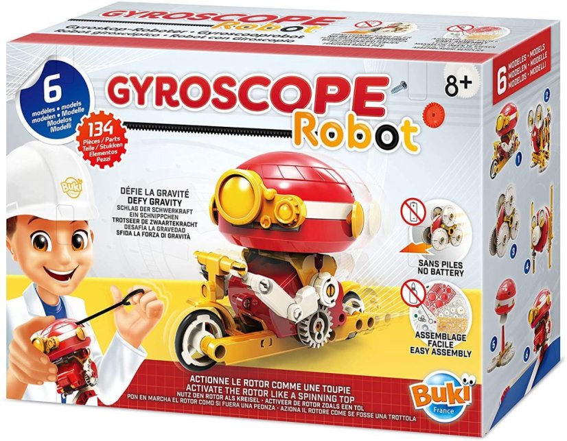 Z dielikov poskladaj jeden zo 6 modelov (bugina, motorka, horská dráha, bláznivý robot, robot na chodúľoch), ktorým gyroskop po zapnutí vdýchne život a pomôže udržovať rovnováhu.