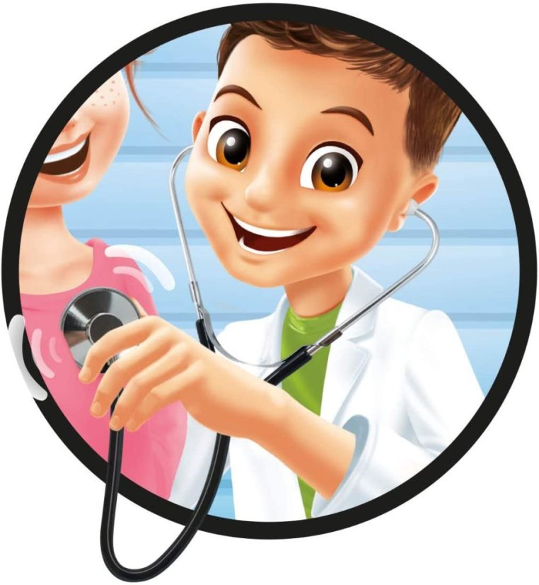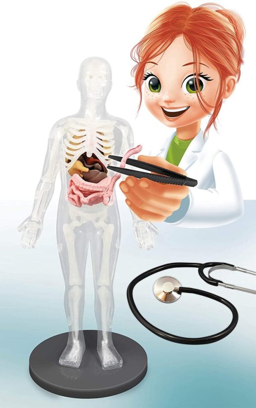 Model ľudského tela je rozoberateľný a pinzetou možno vyberať jednotlivé orgány, ktoré sú vyrobené z mäkkého materiálu a majú verné farby a tvary. K dispozícii je aj stojan a kostra, ktorá v noci svieti. Súprava obsahuje aj funkčný detský stetoskop (kov / plast), ktorým je možné počúvať tlkot srdca.