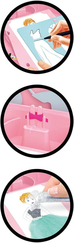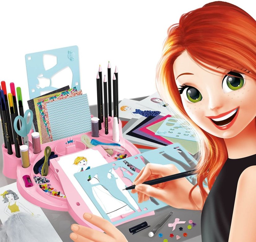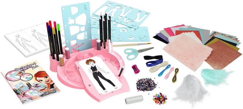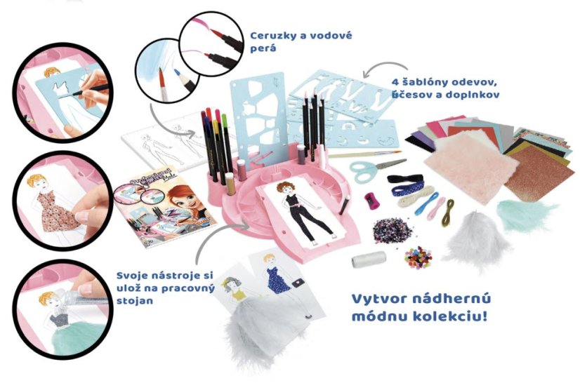 Vyberte si svoju predlohu, navrhnite oblečenie podľa šablón a potom ich vyplňte pomocou množstva rôzneho príslušenstva, ktoré nájdete v balení.